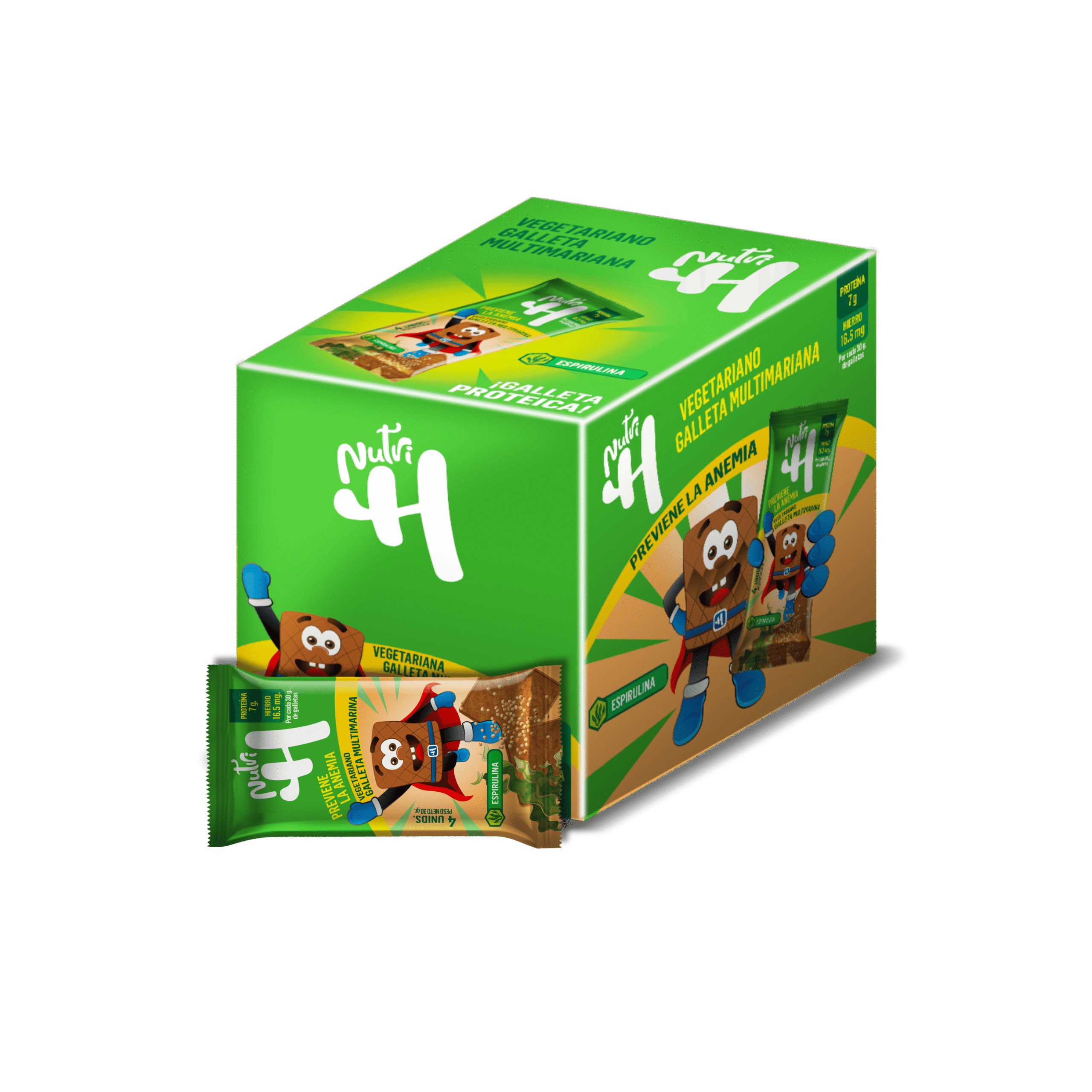 La Galleta Nutri H Clásica es Antianémica, formulada para combatir la desnutrición y la anemia en una presentación vegetariana. Aumenta el nivel de hemoglobina en la sangre en un periodo no mayor a dos meses. Apto para toda la familia.